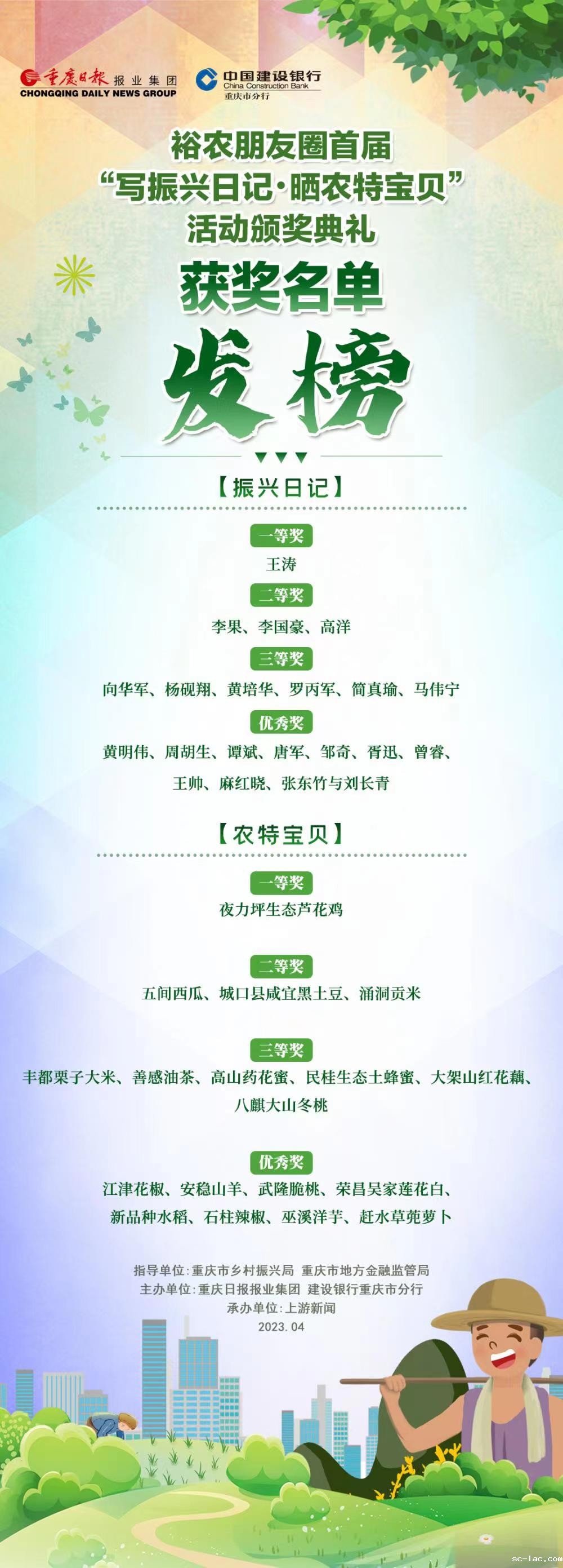 重庆市裕农朋友圈首届“写振兴日记·晒农特宝贝”活动是在重庆市乡村振兴局、重庆市地方金融监管局的指导下,于2022年9月23日第五个中国农民丰收节启动,由重庆日报报业集团联合建设银行分行主办,上游新闻承办。本次活动按照“线上点赞占比40%+线下评审占比60%”的评选办法,评选出了“重庆市十大农特宝贝”和“重庆市十大振兴日记”。