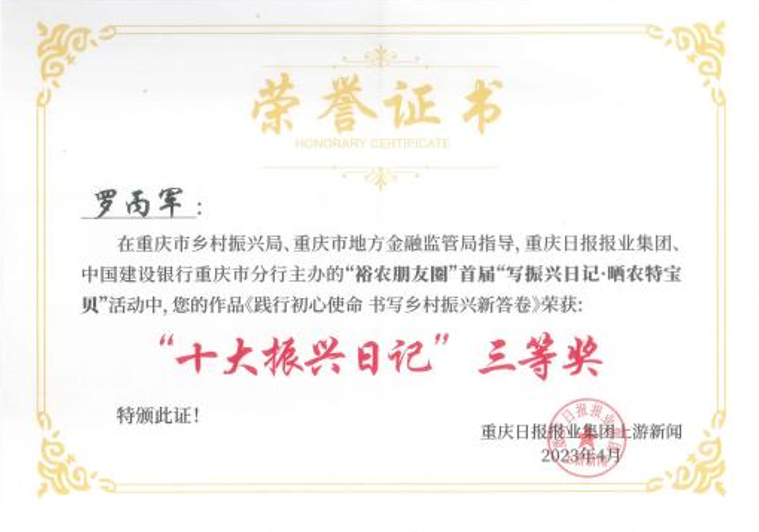 4月8日,上游新闻裕农朋友圈首届“写振兴日记·晒农特宝贝”颁奖典礼,在重庆国际会议展览中心(南坪)隆重举行。外国语学院驻云阳县栖霞镇吉平村第一书记罗丙军的作品荣获“十大振兴日记”三等奖。
