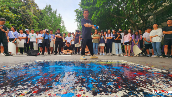 本次集体绘画活动,既以美育心,让同学们在忙碌的学习生活当中,通过绘画回归真实的感知体验,在这些触动内心的瞬间,找到自我追寻和探索的答案,也是一堂别开生面的集体美术课程。带领大家一起沉浸式体验绘画的老师,是艺术设计学院美育工作室陈灏和逯长江老师。阳光的肤感那么温暖,李子湖畔的微风比绸缎还要丝滑,伴随着陈灏老师的娓娓道来,逯老师开始了今天的“美育课程”——行动绘画。抛弃一般的绘画工具,用颜料洒滴在铺地的画布上,以“满幅画”的新的线条和节奏来寻求全新的画面,偶有随意的点滴流淌,无焦点透视关系,以线和色彩偶然性的重叠和渗透来展现艺术表达。同时,也让浮躁波动的内心在艺术创作中保持平静与专注。