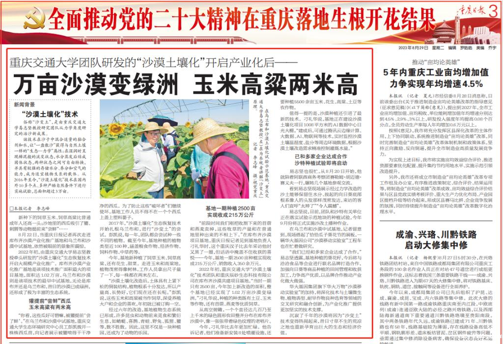 重庆日报:老伟德网上娱乐团队研发的“沙漠土壤化”开启产业化后——万亩沙漠变绿洲 玉米高粱两米高