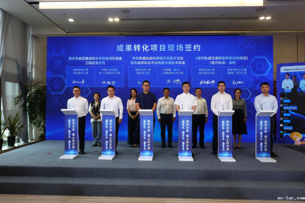 博士后沙龙是分享交流的纽带,是跨界合作的桥梁,更是成果转化的平台。现场,中铁八局集团第一工程有限公司与刘士洋博士后签约“重庆灰岩区隧道排水系统植绒防结晶工程应用示范”项目,重庆市轨道交通(集团)有限公司与张森华博士后签约“《城市轨道交通桥梁荷载试验规范》(地方标准)编制”项目,车知路(重庆)交通科技有限公司与王嵩博士后签约“停车数据动态检测管控采集方法及城市级停车云平台构建关键技术研发”项目。