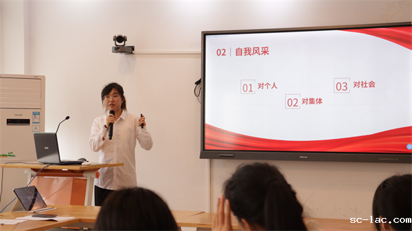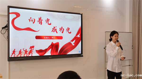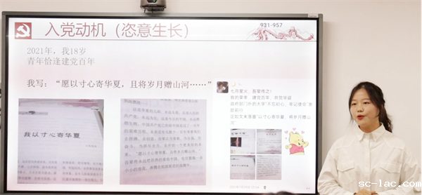 “进入大学,我积极递交入党申请书,我希望变成一朵小小浪花,奔腾地汇入时代发展的浪潮中去。成为积极分子后,我更主动地去参与志愿活动,去敬老院,看迟暮老人,他们会拉着我们的手说很多话,去医院,感受比信仰更虔诚的祈祷,我更加明白‘无穷的远方,无数的人们’对于我们而言意味着什么......”熊茂伶同学声情并茂地讲述自己一步步以实际行动向党组织靠拢的事迹。