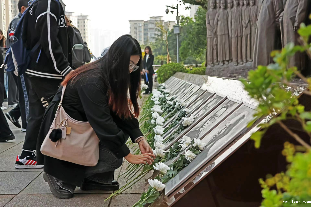 ▲重庆大学青年学生向红岩烈士敬献鲜花。重庆大学供图