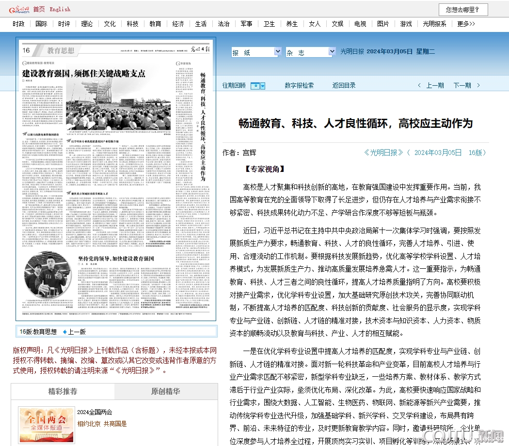 畅通教育、科技、人才良性循环,高校应主动作为-光明日报-光明网 https://epaper.gmw.cn/gmrb/html/2024-03/05/nw.D110000gmrb_20240305_2-16.htm
