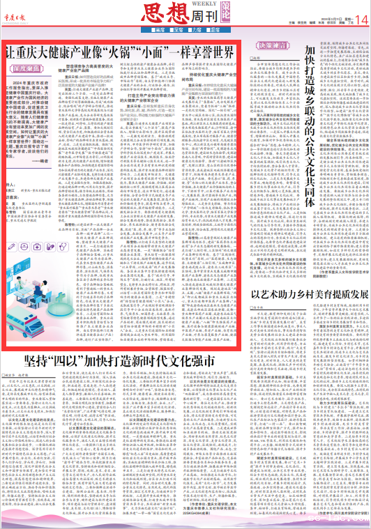 2024年重庆市政府工作报告指出,要深入推进健康中国重庆行动。大健康产业作为国民经济的重要组成部分,对推动健康中国建设,促进重庆卫生行业的健康发展具有重大意义。随着人们健康意识的不断提高,大健康产业有望迎来更加广阔的发展空间。如何让重庆的大健康产业像“火锅”“小面”一样享誉世界?围绕这一主题,重庆日报专访了相关专家学者,谈谈他们的看法。