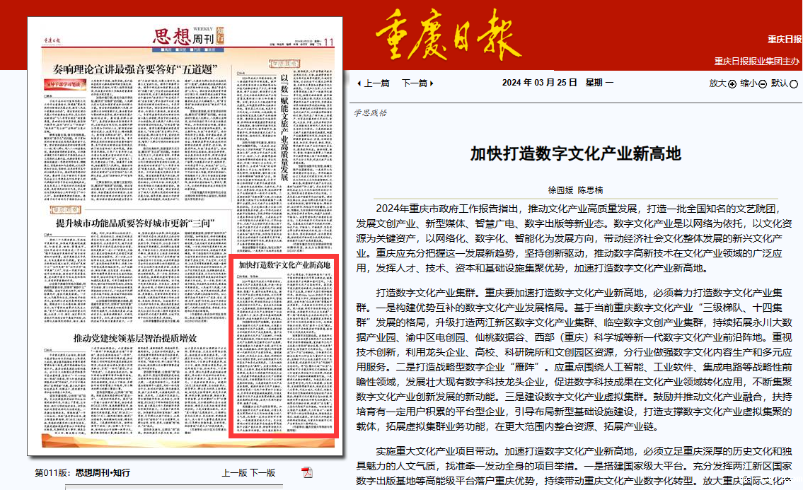 重庆日报:加快打造数字文化产业新高地·重庆日报数字报 (cqrb.cn)