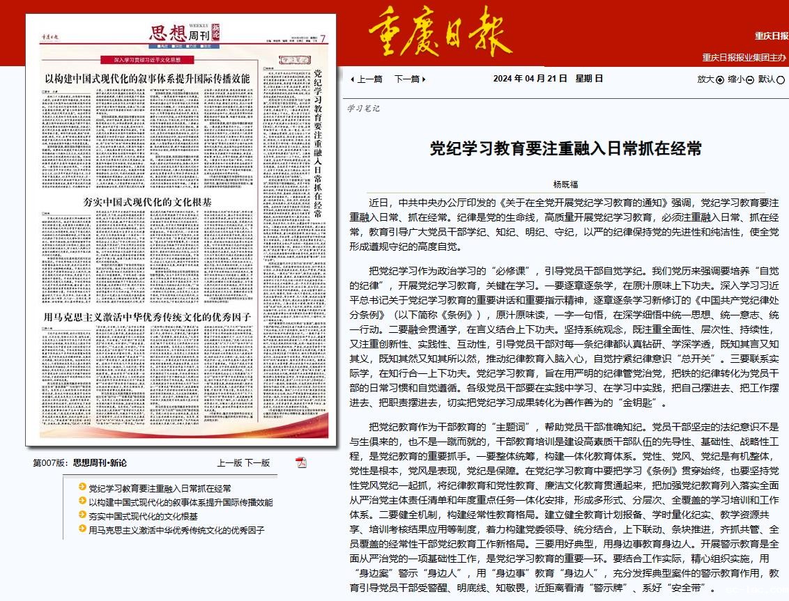 近日,中共中央办公厅印发的《关于在全党开展党纪学习教育的通知》强调,党纪学习教育要注重融入日常、抓在经常。纪律是党的生命线,高质量开展党纪学习教育,必须注重融入日常、抓在经常,教育引导广大党员干部学纪、知纪、明纪、守纪,以严的纪律保持党的先进性和纯洁性,使全党形成遵规守纪的高度自觉。把党纪学习作为政治学习的“必修课”,引导党员干部自觉学纪。我们党历来强调要培养“自觉的纪律”,开展党纪学习教育,关键在学习。一要逐章逐条学,在原汁原味上下功夫。深入学习习近平总书记关于党纪学习教育的重要讲话和重要指示精神,逐章逐条学习新修订的《中国共产党纪律处分条例》(以下简称《条例》),原汁原味读,一字一句悟,在深学细悟中统一思想、统一意志、统一行动。二要融会贯通学,在言义结合上下功夫。坚持系统观念,既注重全面性、层次性、持续性,又注重创新性、实践性、互动性,引导党员干部对每一条纪律都认真钻研、学深学透,既知其言又知其义,既知其然又知其所以然,推动纪律教育入脑入心,自觉拧紧纪律意识“总开关”。三要联系实际学,在知行合一上下功夫。党纪学习教育,旨在用严明的纪律管党治党,把铁的纪律转化为党员干部的日常习惯和自觉遵循。各级党员干部要在实践中学习、在学习中实践,把自己摆进去、把工作摆进去、把职责摆进去,切实把党纪学习成果转化为善作善为的“金钥匙”。