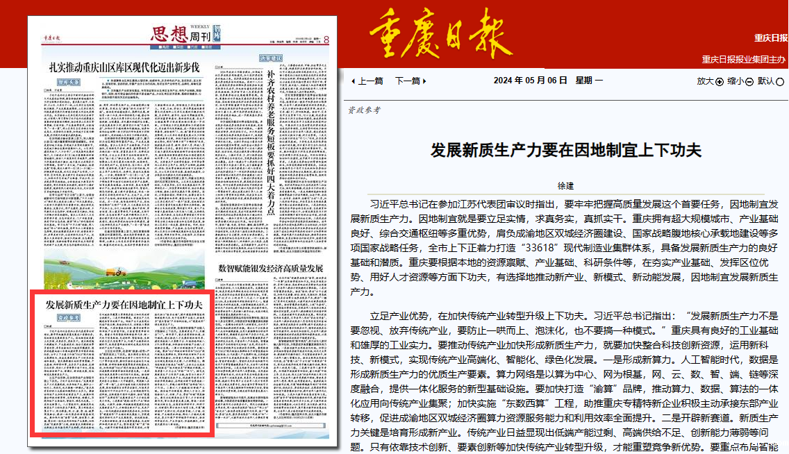 习近平总书记在参加江苏代表团审议时指出,要牢牢把握高质量发展这个首要任务,因地制宜发展新质生产力。因地制宜就是要立足实情,求真务实,真抓实干。重庆拥有超大规模城市、产业基础良好、综合交通枢纽等多重优势,肩负成渝地区双城经济圈建设、国家战略腹地核心承载地建设等多项国家战略任务,全市上下正着力打造“33618”现代制造业集群体系,具备发展新质生产力的良好基础和潜质。重庆要根据本地的资源禀赋、产业基础、科研条件等,在夯实产业基础、发挥区位优势、用好人才资源等方面下功夫,有选择地推动新产业、新模式、新动能发展,因地制宜发展新质生产力。