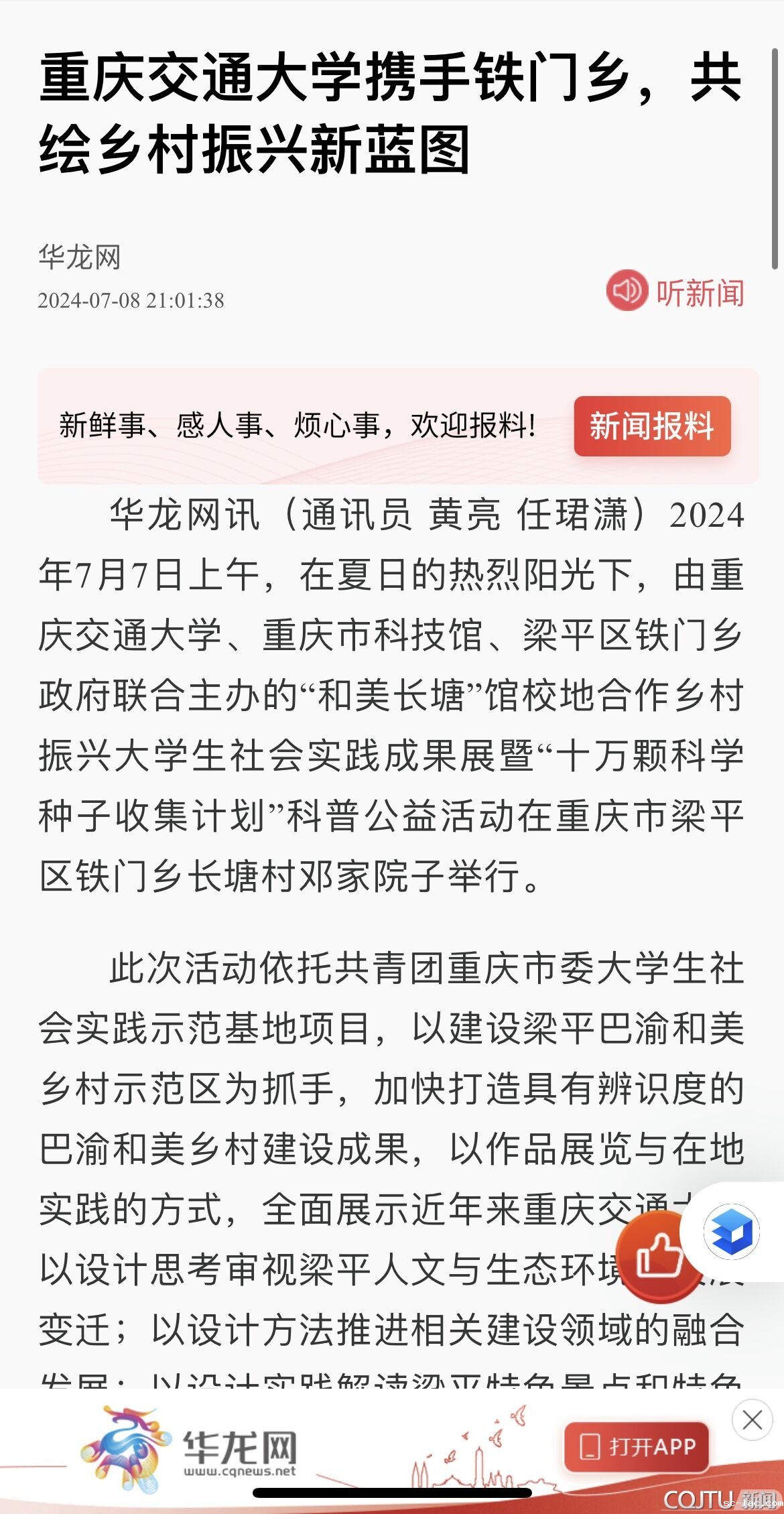 华龙网讯(通讯员黄亮任珺潇)2024年7月7日上午,在夏日的热烈阳光下,由老伟德网上娱乐、重庆市科技馆、梁平区铁门乡政府联合主办的“和美长塘”馆校地合作乡村振兴大学生社会实践成果展暨“十万颗科学种子收集计划”科普公益活动在重庆市梁平区铁门乡长塘村邓家院子举行。