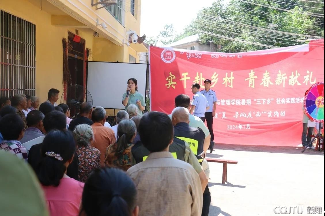 “小朋友们,如果有人向你兜售游戏装备或者游戏皮肤,你应该怎么做?”“如果接到陌生来电,你应该怎么做?”“我会选择不相信。”“我会选择立即挂掉电话。”在民主镇文福村的院坝上,实践团成员们与周警官一起组织了一场趣味十足的“院坝课堂”。课堂上,实践团成员们用通俗易懂的方言并结合实际案例向村民们进行讲解,同时还开展了有奖问答游戏,将“反诈大转盘”和“平安视力表”融入课堂,与村民们打成一片、欢乐互动,在寓教于乐的氛围中,有效传递反诈骗的知识。