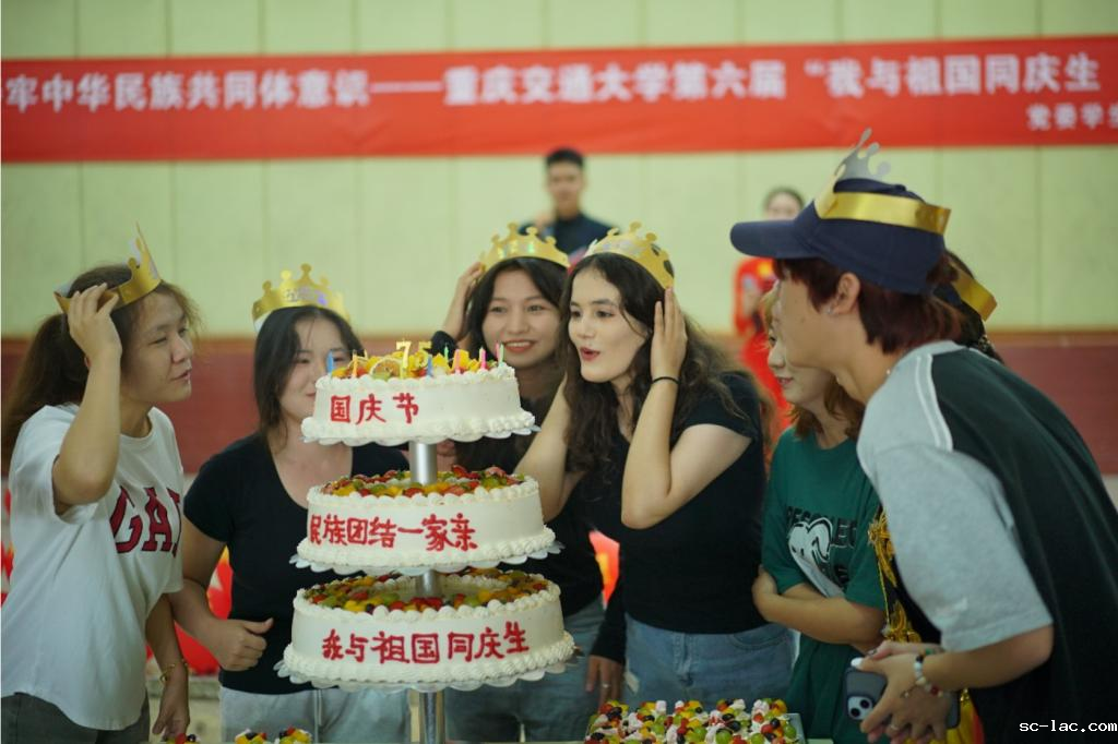 当天,与国庆同生日的同学们还收到一份特别的惊喜。精美的蛋糕缓缓登场,伴随着温馨的《生日快乐》旋律,全场师生对“寿星”们表达了衷心的祝福,一同唱起对祖国繁荣昌盛的颂歌。