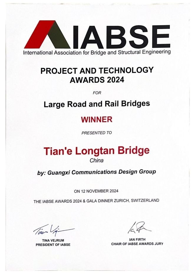 天峨龙滩特大桥横跨河池市天峨县龙滩水库,主桥为跨径600米的上承式劲性骨架混凝土拱桥,是目前世界最大跨度劲性骨架混凝土拱桥,引领世界拱桥正式迈入600米级时代,实现世界拱桥发展史上里程碑式的跨越。在本次评选中,天峨龙滩特大桥击败了瑞典Skuru大桥、美国Wellsburg拱桥等大跨桥梁,摘得IABSE大型公路与铁路桥最高奖。
