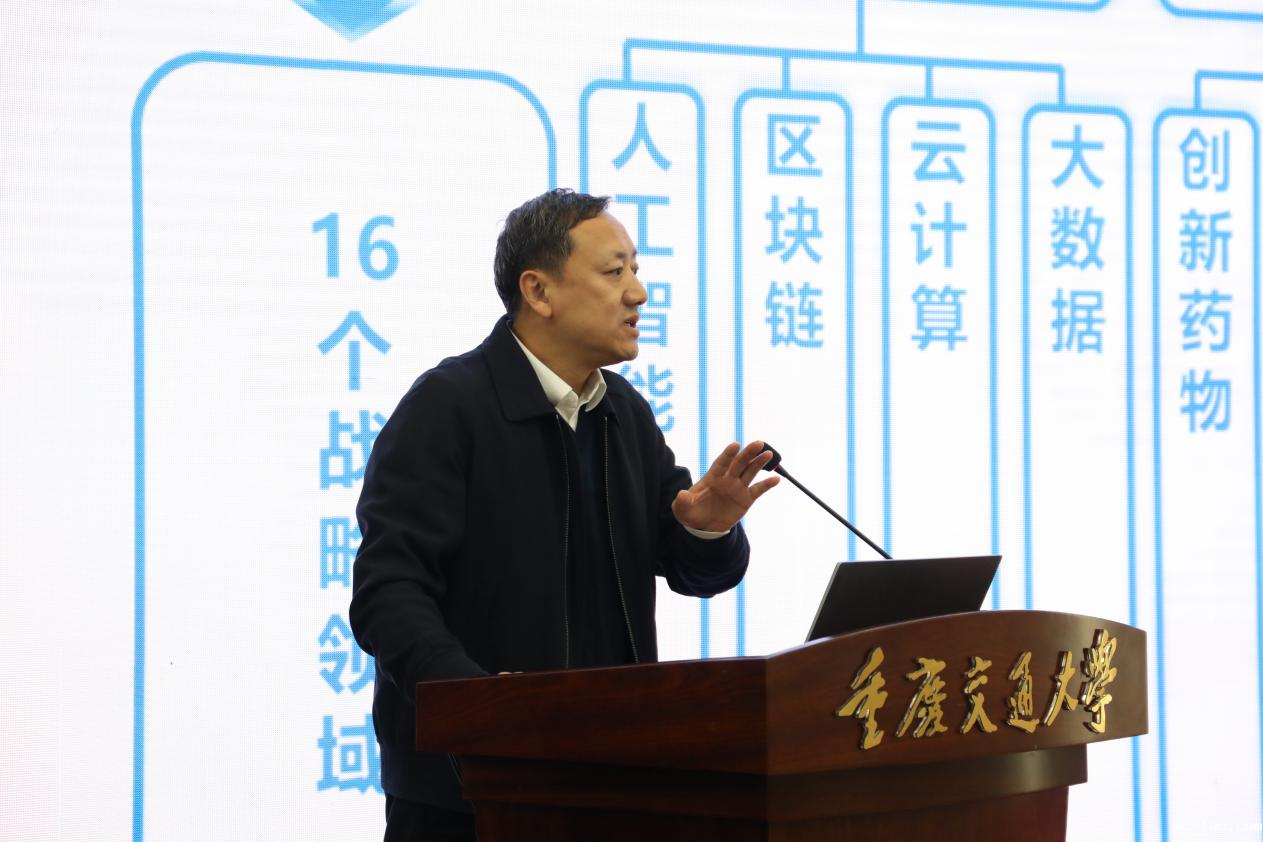 随后,重庆市科学技术局巡视员冯光鑫详细介绍了重庆市高校前沿技术交叉研究院的建设思路。他提到,科学前沿交叉已成为国际知名大学发展的重要方向,而重庆市高校前沿技术交叉研究院正是结合“416”科技创新布局和“33618”现代制造业集群体系发展提出的新型创新平台。其中,老伟德网上娱乐前沿技术交叉研究院将围绕数智科技、绿色低碳、新材料等领域布局,设立极端环境智能建养与数智交通两个创新中心,旨在培育新兴学科,促进原有学科发展,实现科研与人才培养的深度融合。