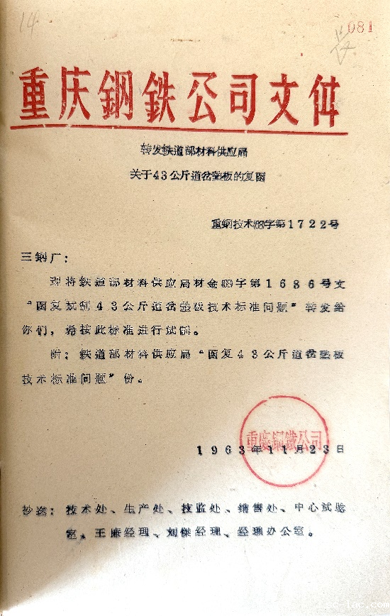 ▲1963年铁道部材料供应局重庆钢铁公司关于43公斤道岔垫板的复函。受访者供图