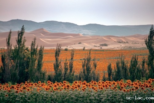 易志坚在乌兰布和沙漠基地察看向日葵的长势。 受访者供图