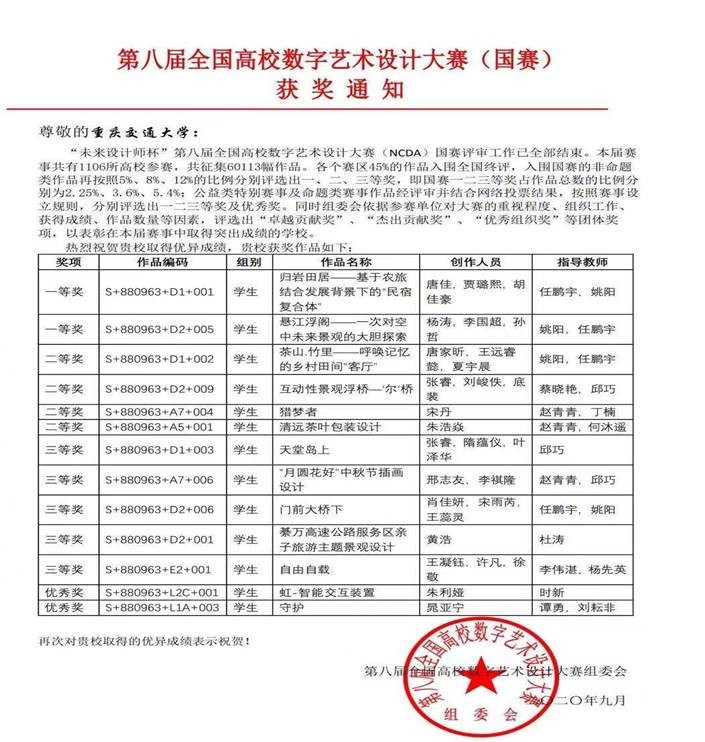 此次大赛全国参赛高校1106所,共征集作品60113幅。我校建筑与城市规划学院、艺术设计学院学子在大赛中斩获佳绩:获全国总决赛奖项13项、省区级奖项47项,其中《归岩田居——基于农旅结合发展背景下的“民宿复合体”》(指导教师:任鹏宇、姚阳,参赛学生:唐佳、贾璐熙、佳豪胡)、《悬江浮阁——一次对空中未来景观的大胆探索》(指导教师:姚阳、任鹏宇,参赛学生:杨涛、李国超、孙哲)2项作品获得全国总决赛一等奖;《猎梦者》(指导教师:赵青青、丁楠,参赛学生:宋丹)等其他共计4项参赛作品获全国总决赛二等奖、另有5项参赛作品获全国总决赛三等奖、2项参赛作品获全国总决赛优秀奖;在省区级分赛中,我校学生取得一等奖17项、二等奖21项、三等奖21项的佳绩。