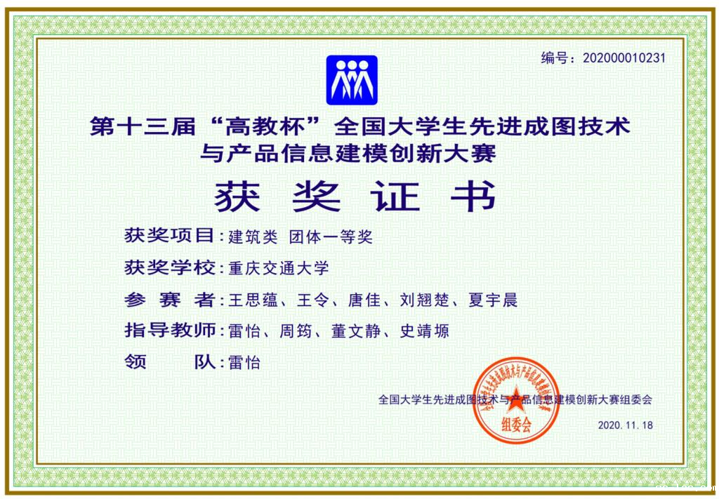 “高教杯”全国大学生先进成图技术与产品信息建模创新大赛是国内图学类级别最高的学科赛事,因其参赛规模大、水平高、人数多,被誉为“图学界的奥林匹克”。为备战此次大赛,建规学院提前启动相关工作,在建筑类本科生中进行选手选拔和团队组建,并在国赛之前,针对国赛要求对参赛队员进行了为期一周的集中训练。经过参赛选手半年的刻苦训练和指导教师的悉心指导,最终在重庆市和全国先进成图大赛的建筑类别中喜获大奖,为学校争得了荣誉。接下来,学院将进一步总结比赛得失和组织经验,争取来年再创佳绩。