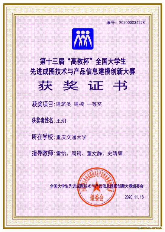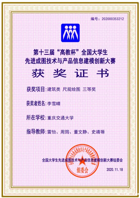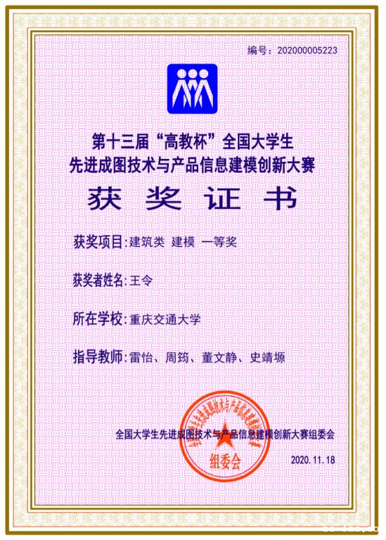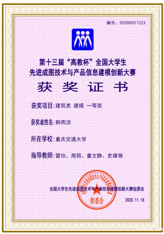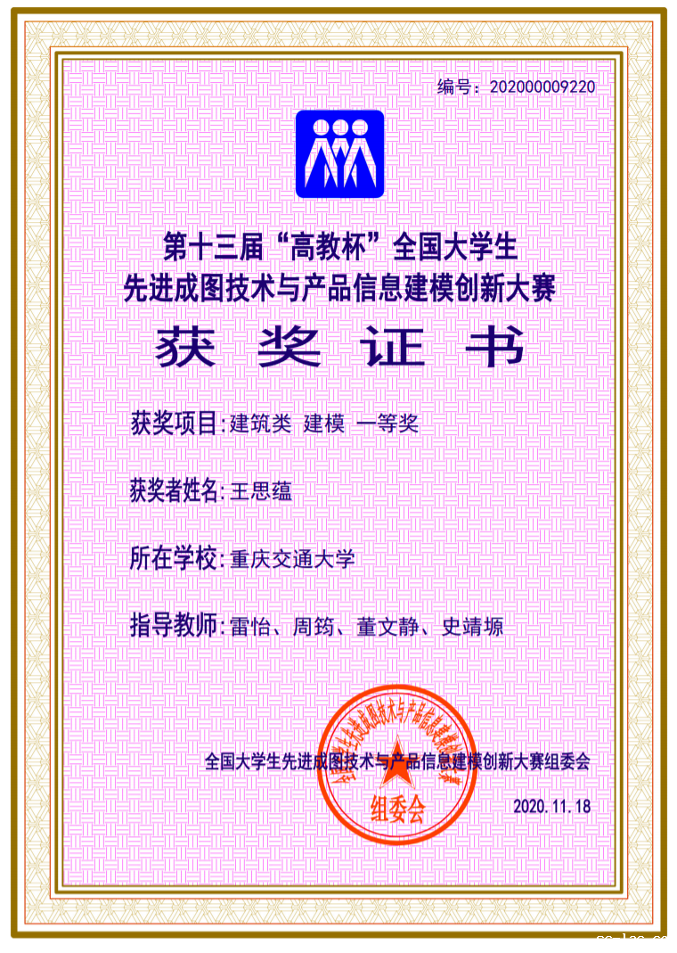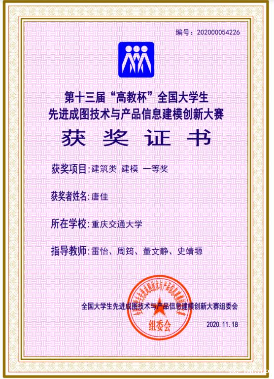 2020年11月13日-15日,由教育部高等学校工程图学课程教学指导委员会、中国图学学会制图技术专业委员会、中国图学学会产品信息建模专业委员会联合举办的第十三届“高教杯”全国大学生先进成图技术与产品信息建模创新大赛在南昌航空大学举行,因受疫情影响,大赛采取线上形式举行。本届大赛共吸引了全国395所学校的647支参赛队伍近7000名师生参赛。我校建规学院和河海学院积极组队参赛、搭建在线赛场,保障学生顺利参赛并取得优异成绩。建规学院建筑学专业2018级的9名同学由周筠、雷怡、董文静、史靖塬等指导老师带队参赛,斩获建筑类团体一等奖以及个人单项一等奖5项、二等奖3项、三等奖1项,河海学院参赛队获得水利类团体三等奖。