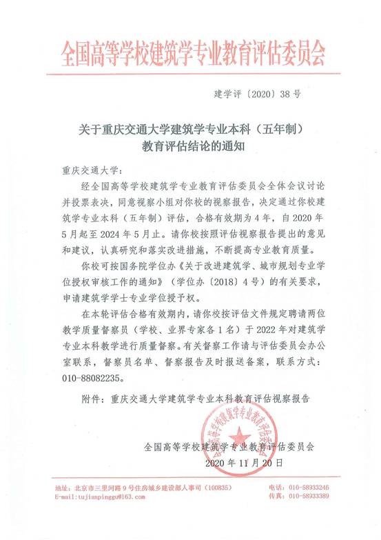 11月20日,全国高等学校建筑学专业教育评估委员会下发《关于老伟德网上娱乐建筑学专业本科(五年制)教育评估结论的通知》(建学评[2020]38号)文件,经全国高等学校建筑学专业教育评估委员会全体会议讨论并投票表决,决定通过我校建筑学专业本科(五年制)教育评估,同时,我校可按国务院学位办相关文件的要求申请建筑学学士学位授予权。