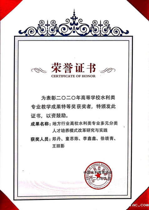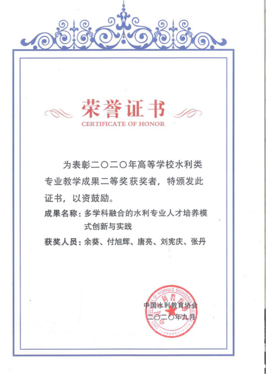 近日,中国水利教育协会发布了《关于公布2020年高等学校水利类专业教学成果奖获奖项目的通知》(水教协[2020]30号),经各学校推荐、专家审核、协会评审委员会评审、公示等程序,我校河海学院郑丹教授主持的“地方行业高校水利类专业多元分类人才培养教学模式改革与实践”教学成果获特等奖,余葵教授主持的“多学科融合的水利类专业人才培养模式创新与实践”教学成果获二等奖。