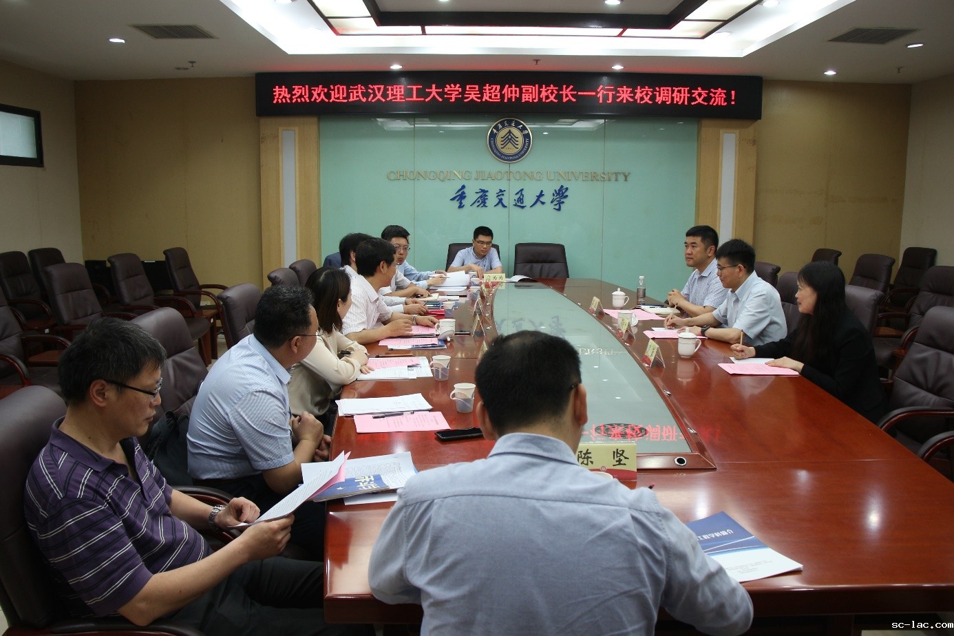 与会人员在明德楼306会议室进行了座谈交流。赵明阶副校长对吴超仲副校长一行表示欢迎,并介绍我校基本情况。吴超仲副校长介绍了武汉理工大学基本情况及本次调研目的。交通运输学院和材料学院分别对我校交通运输工程、材料科学与工程两个学科的建设发展情况做了介绍,武汉理工大学同仁也分享了这两个学科建设的经验做法。双方围绕本科专业设置,本科、研究生人才培养、科研管理、智能交通交叉学科建设等方面进行了深入交流。
