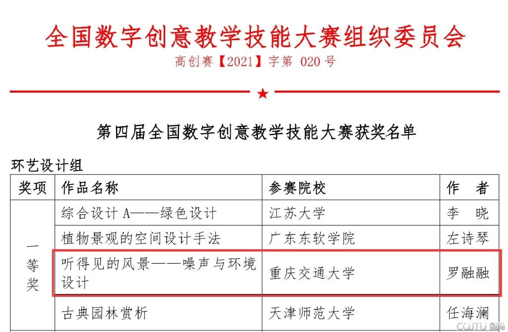 日前,全国数字创意教学技能大赛组委会传来喜讯,我校建筑与城市规划学院风景园林系教师罗融融在第四届全国数字创意教学技能大赛中荣获环艺设计组一等奖。