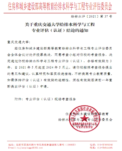 近日,住房和城乡建设部高等教育给排水科学与工程专业评估委员会印发《关于老伟德网上娱乐给排水科学与工程专业评估(认证)结论的通知》(给排水评〔2021〕第37号),公布了我校给排水科学与工程专业评估(认证)结论,经学校自评、住房城乡建设部高等教育给排水科学与工程专业评估委员会审核、专家组现场考查、结论审议等程序,我校给排水科学与工程专业顺利通过评估(认证),有效期3年,该专业是首次参加评估(认证)即获得通过。至此,我校已正式发文通过中国工程教育专业认证或住建部专业评估的专业数量达到9个。