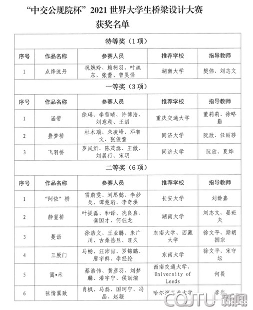 6月18日下午,2021世界大学生桥梁设计大赛决赛在长安大学文化艺术中心举行,十支来自全国高校的设计团队依次上台通过丰富多彩的形式展演了自己的设计作品。最终,我校建筑与城市规划学院与土木工程学院联合选送的作品《涵带》(参赛学生:徐瑶、李雪晴、许博浩、刘意湖、王滔;指导教师:董莉莉、徐略勤)荣获一等奖。董莉莉、徐略勤荣获优秀指导教师奖。我校也荣获优秀组织奖,建筑与城市规划学院院长董莉莉代表学校上台领奖。
