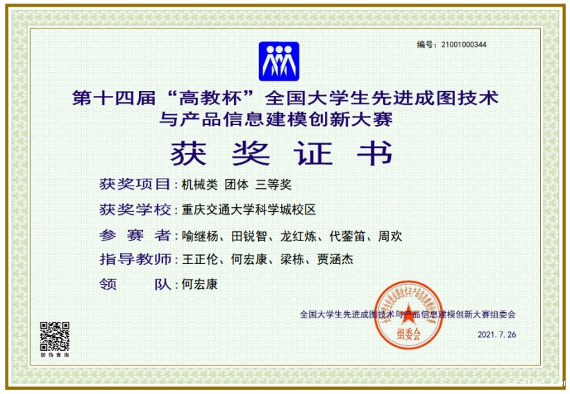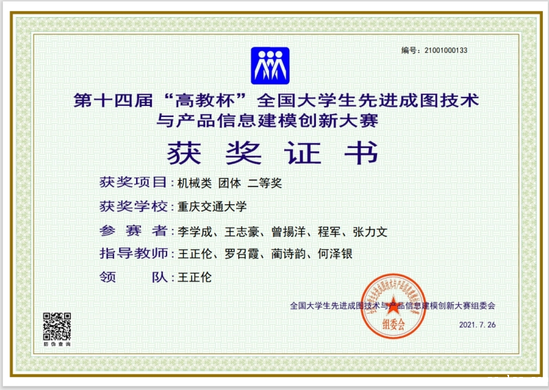机电与车辆工程学院王正伦、罗召霞、何泽银和航空学院蔺诗韵四位老师指导的李学成、王志豪、曾揚洋、程军、张力文同学获得机械类团体二等奖;