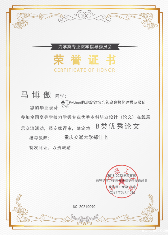 近日,教育部高等学校力学类专业教学指导委员会公布了“第二届全国高等学校力学类专业优秀本科毕业设计(论文)在线展示交流活动”获奖论文,我校2021届工程力学专业马博傲同学的本科毕业论文“基于Python的波纹钢综合管廊参数化建模及数值分析”荣获B类优秀论文,指导老师为郑佳艳副教授。