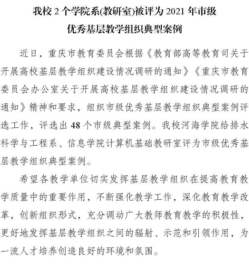 近日,重庆市教育委员会根据《教育部高等教育司关于开展高校基层教学组织建设情况调研的通知》《重庆市教育委员会办公室关于开展高校基层教学组织建设情况调研的通知》精神和要求,组织市级优秀基层教学组织典型案例评选工作,评选出48个市级典型案例。我校河海学院给排水科学与工程系、信息学院计算机基础教研室评为市级优秀基层教学组织典型案例。