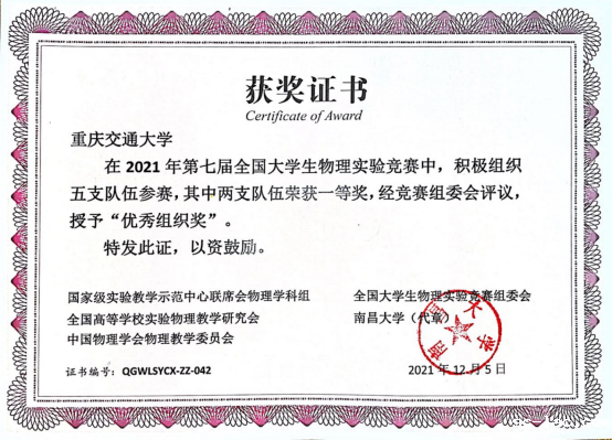 喜讯:我校被授予第七届全国大学生物理实验竞赛“优秀组织奖”