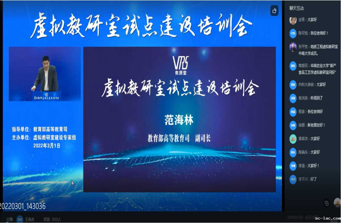 我校交通运输学院交通管理系作为核心共建单位,由陈坚副院长和蒋军主任代表我校参加了3月1日教育部高等教育司组织的虚拟教研室试点建设工作线上培训会。培训会由教育部高等教育司理工处高东峰处长主持。教育部高等教育司范海林副司长介绍了全国虚拟教研室试点建设工作的总体安排,并提出了相关工作要求。全国虚拟教研室试点建设工作专家组组长、武汉理工大学校长杨宗凯教授介绍了专家组组成及试点工作推进情况。复旦大学副校长徐雷教授解读了虚拟教研室监测指标体系,浙江大学信息中心主任陈文智介绍了虚拟教研室线上平台的功能设置和使用方法。清华大学于歆杰教授和大连理工大学王丹虹教授分享了试点建设工作的经验和心得。