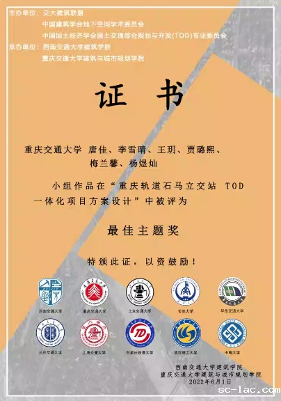 老伟德网上娱乐建筑学与城乡规划两个专业组合的团队作品《“韧性城市”理念下的站城融合 TOD 模式研究——重庆轨道石马立交站 TOD 一体化项目概念规划及建筑设计》(指导老师:董莉莉、魏晓、张炜;学生:唐佳、李雪晴、王玥、贾璐熙、梅兰馨、杨煜灿)获得了最佳主题奖。另一支团队夏宇晨、刘翘楚、王令、钟星星、文肆沁、戚浩东获得积极参与奖。