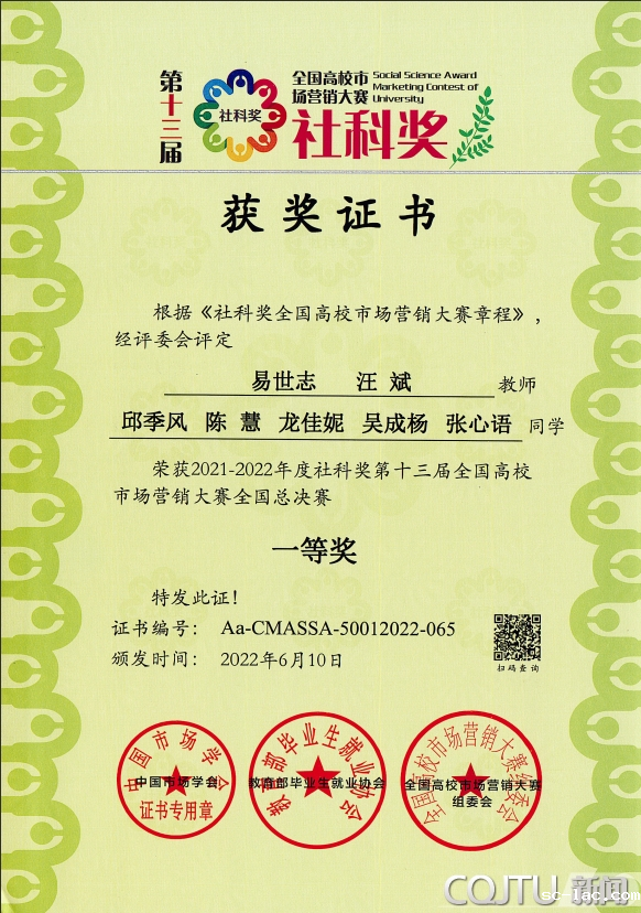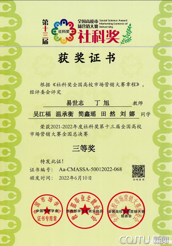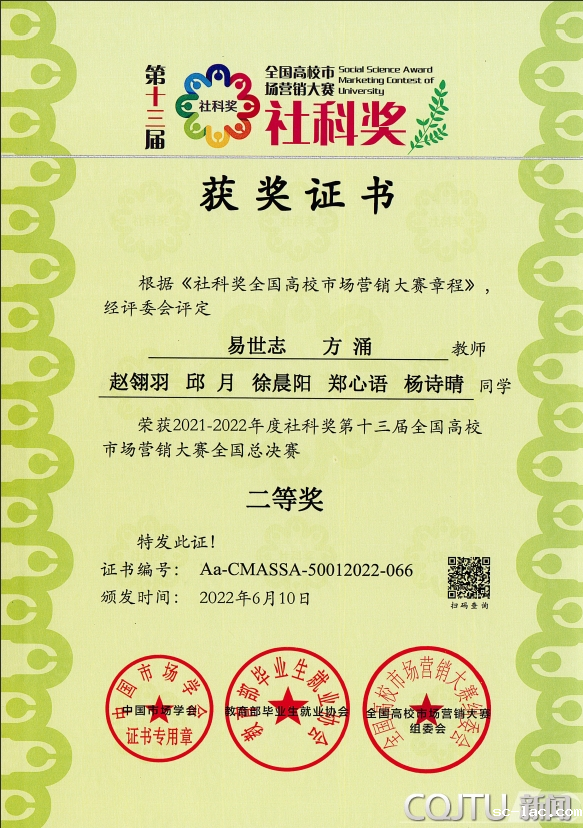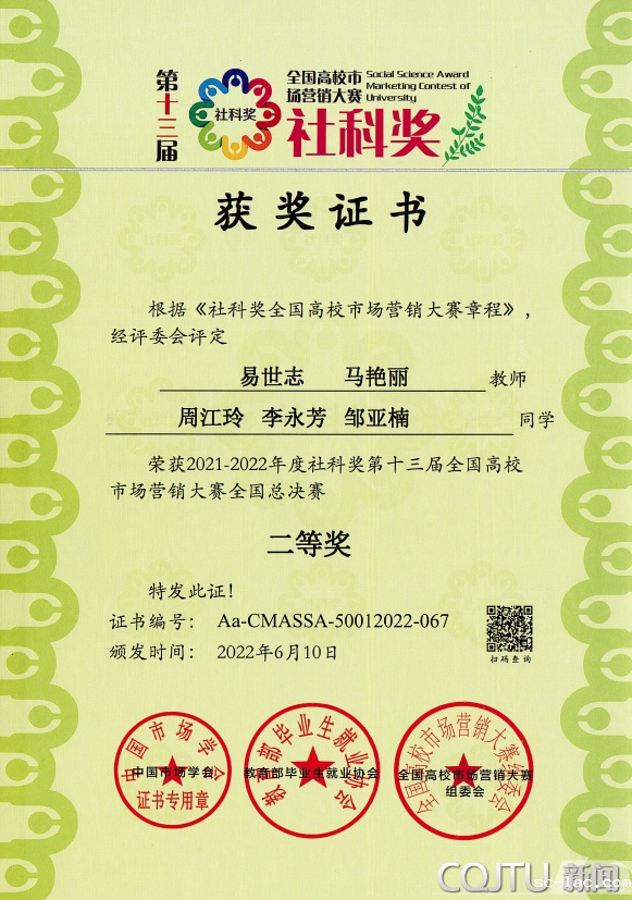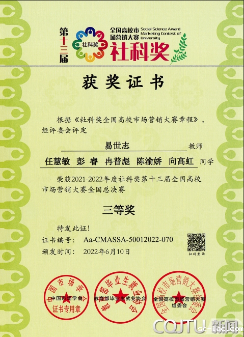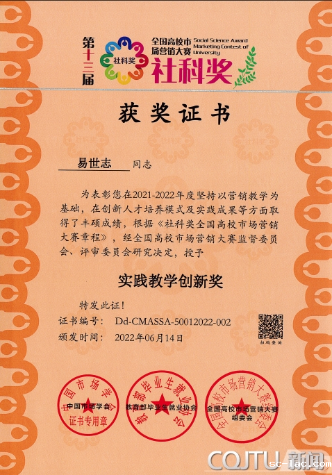 2022年5月28日,由中国市场学会、教育部高校毕业生就业协会、教育部全国高校现代远程教育协作组主办的社科奖第十三届全国高校市场营销大赛全国总决赛在北京顺利落幕。以我校市场营销2019级学生为主的团队喜获佳绩,获全国总决赛一等奖1项、二等奖2项、三等奖3项,创我校在本项赛事中的历史最好成绩。同时,学校获“优秀组织奖”,易世志老师获“实践教学创新奖”。