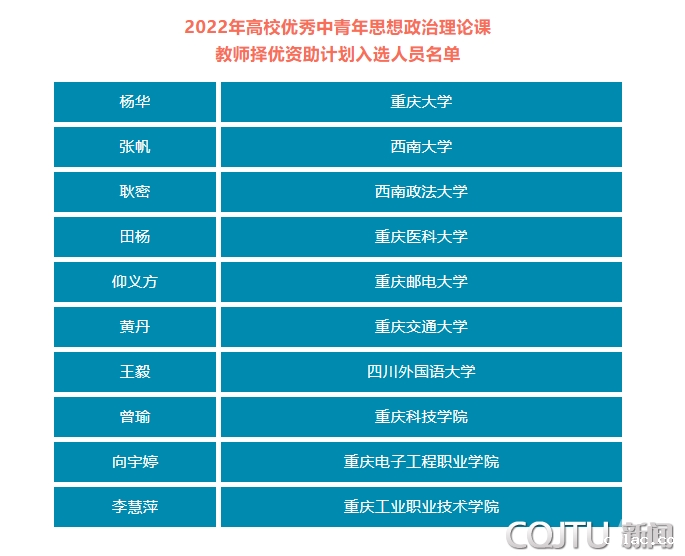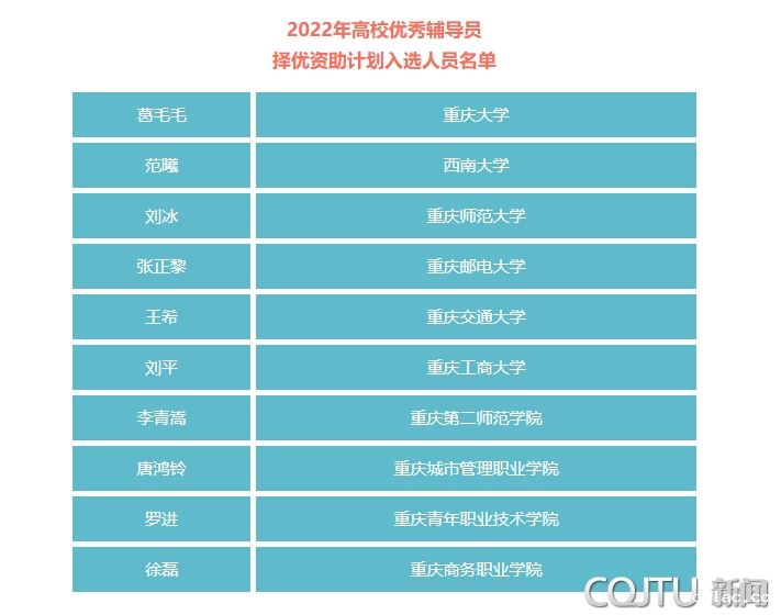 据了解,根据《中共重庆市委教育工作委员会办公室关于开展2022年高校优秀辅导员择优资助计划评选工作的通知》《中共重庆市委教育工作委员会办公室关于开展2022年高校优秀中青年思想政治理论课教师择优资助计划评选工作的通知》,经学校推荐、专家评审、网上公示等程序,评选出2022年高校优秀辅导员择优资助计划入选人员10名、优秀中青年思想政治理论课教师择优资助计划入选人员10名。