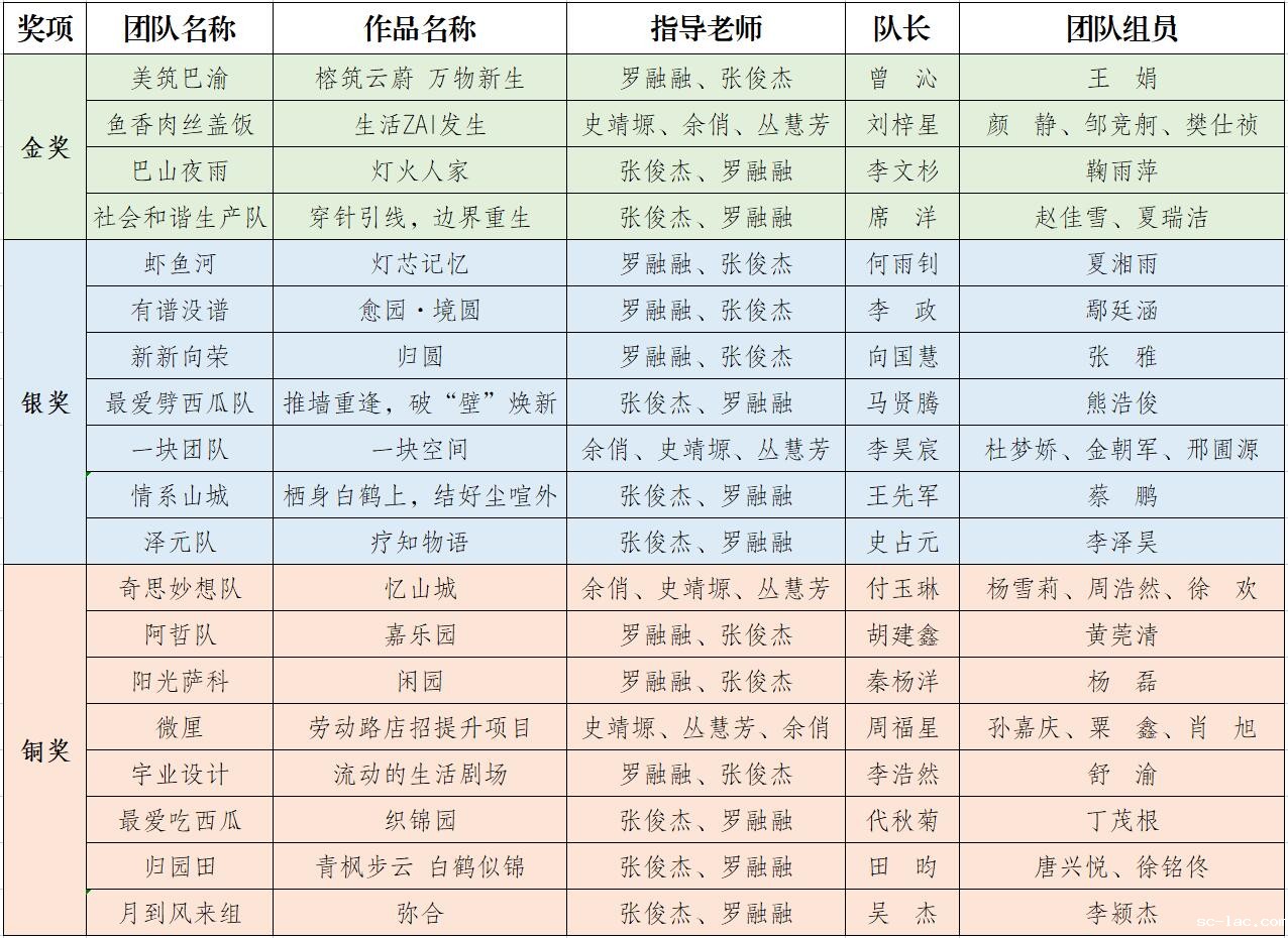 最终,经由行业专家、业主单位、居民代表、媒体代表组成的评审委员会评选,我校学子共计获得4个金奖、7个银奖和8个铜奖,斩获近半数奖项,其中金奖作品《榕筑云蔚 万物新生》获得了大赛第二名的优异成绩。在6月22日举办的“沙坪坝区建设全国青年发展型城市工作推进会”上,我校学生作为大赛获奖选手代表上台领奖。张俊杰、罗融融、史靖塬、余俏、丛慧芳五位老师也因出色的指导工作获评“优秀指导教师”。