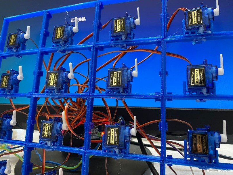 本次建构活动中,有一件作品运用了开源硬件进行创新设计,该团队先通过Rhino3D软件完成三维建模和数字化模型效果的模拟,然后用3D打印机完成框架制作。此设计的创意是通过人体红外传感器采集参观者通过该模型空间的信息,驱动框架上十六个小型舵机组进行转动,每个舵机上连接有片材造型的模型组件,实现模型表皮的造型变化和模型内部空间的调节,团队共设计了三种转动模式,突破了以往单一、固定的模型视觉形式,充分体现了复杂性科学相关理念在模型建构中的创新性运用。在建筑类专业人才培养中尝试去摆脱现代建筑由功能而形式,或者由形式而形式的简单性、机械性思维,转向对建筑和空间对象的意义和价值的关注,真正实现动态复杂性的演绎,对于学生建筑观念的转变有着重要的意义和作用。