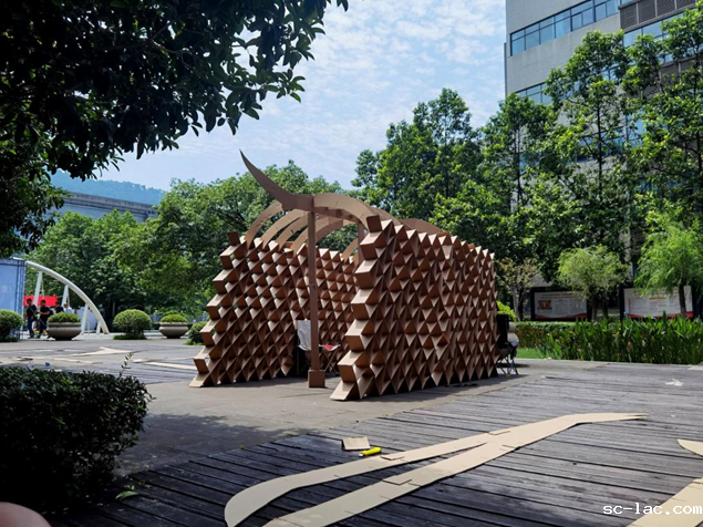 作品采用多个板块拼接插连成为一个整体,犹如错综复杂的树枝在生长发芽。利用板材的特殊性质,巧妙的构思计算得到了一块块秩序井然的构件,平行四边形的局部可满足构件任意生长的韧性,而加筑的竖直方向纸板又可构成一个稳定的三角形,使其能矗立于地面。四块构件汇集在顶部形成一个穹顶赋予了整体的空间感,给人以遮阴庇护之处。两角翘起的是生长的希望,也给整个空间增添了别样的动态。