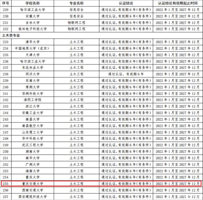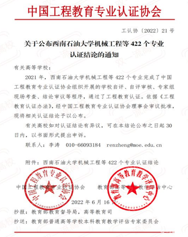 近日,中国工程教育专业认证协会印发《关于公布西南石油大学机械工程等422个专业认证结论的通知》(工认协〔2022〕21号),公布了2021年工程教育专业认证结论,我校车辆工程、计算机科学与技术、土木工程和水利水电工程4个专业经中国工程教育专业认证协会组织开展的学校自评、专业类认证委员会审核、专家组现场(线上)考查、结论审议等程序,顺利通过认证,有效期6年,有效期:2022年1月至2027年12月。四个专业均是首次参加工程教育专业认证即获通过(其中土木工程专业2010年通过住建部专业教育评估,2015年通过复评)。至此,我校通过中国工程教育专业认证数量达到12个。