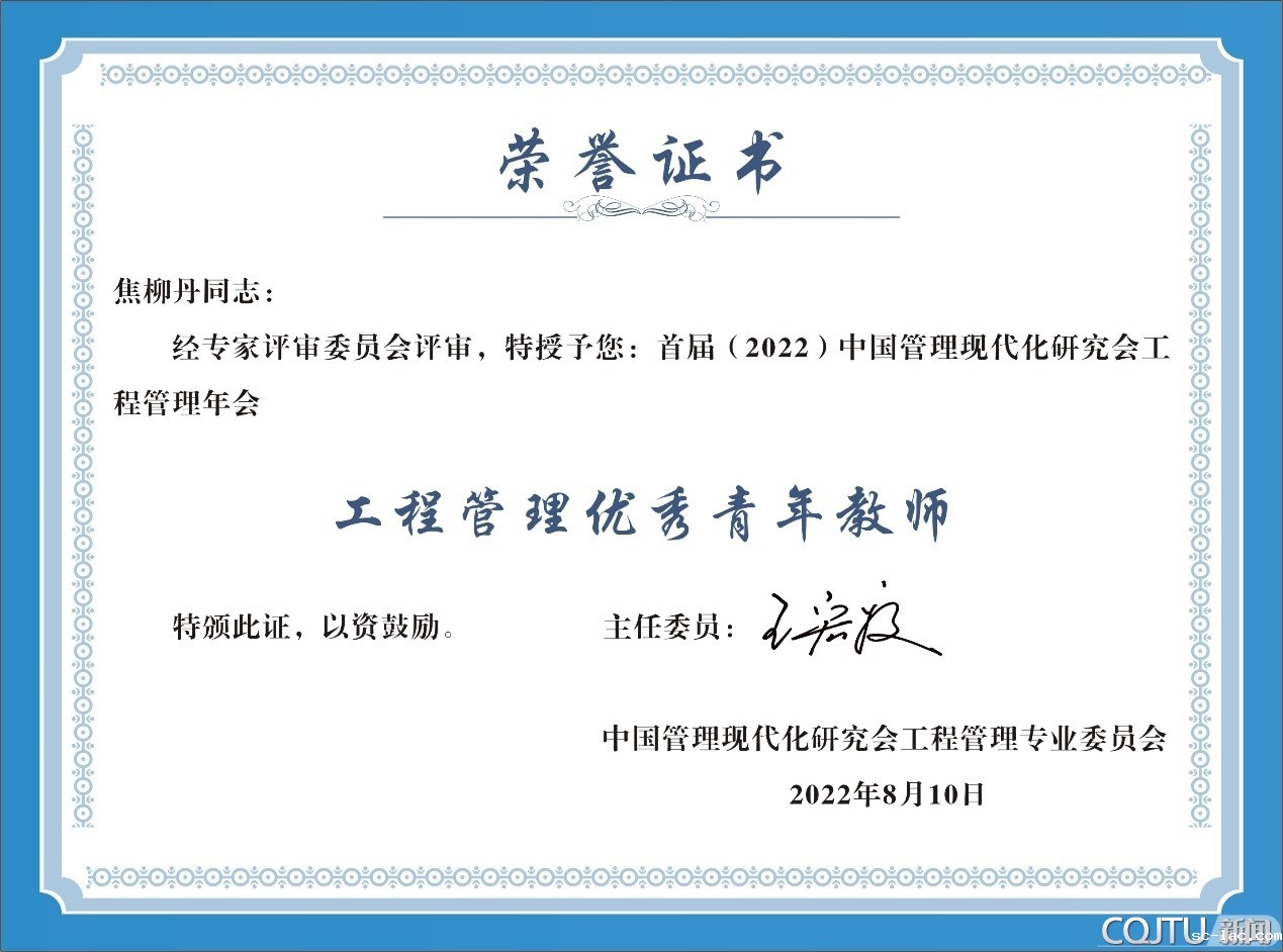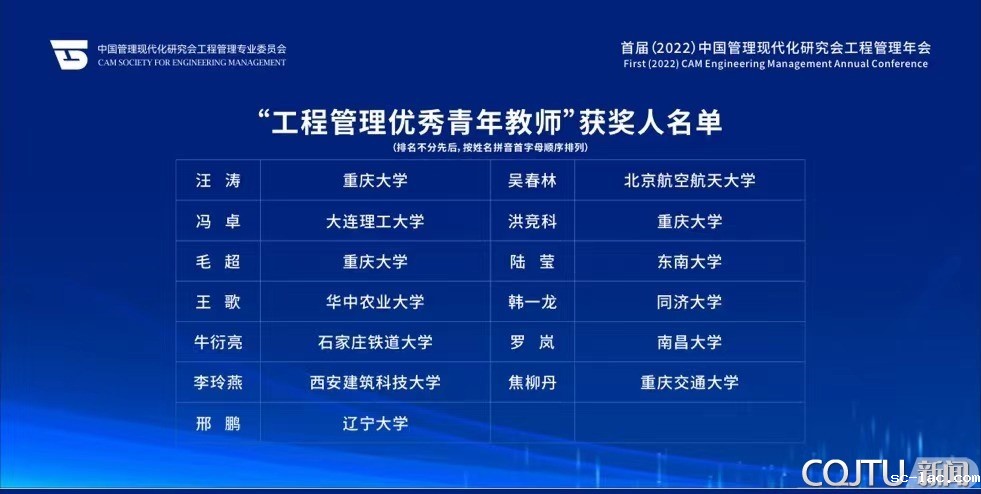 会议期间,主办单位公布了本届年会工程管理优秀青年教师获奖名单,共有13位来自同济大学、东南大学、重庆大学、北京航空航天大学等高校的青年教师获奖。我校经管学院焦柳丹副教授获评此次年会工程管理优秀青年教师。