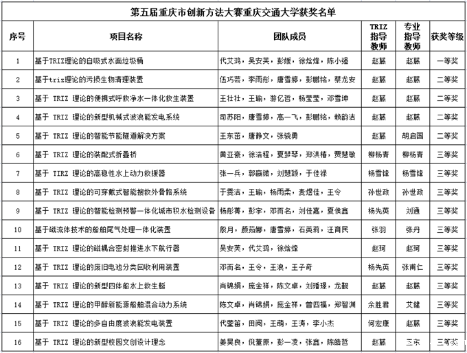 中国创新方法大赛是由中国科协、科技部联合主办的国家级赛事,也是重庆市人民政府纳入重庆市科技创新“十四五”规划(2021—2025年)中支持持续举办中国创新方法大赛等国家级品牌赛事之一。2022年中国创新方法大赛全国总决赛预计于11月下旬在天津拉开帷幕,我校有5个项目推荐参加中国创新方法大赛大学生TRIZ专项赛全国赛(中国TRIZ杯大学生创新方法大赛)。