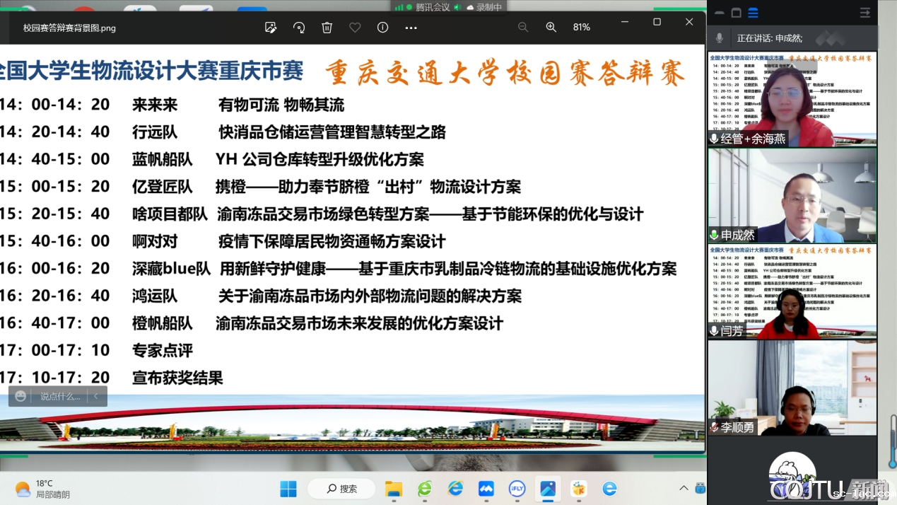 11月20日下午举行线上答辩赛,物流国贸教工党支部的申成然、余海燕、闫芳、李顺勇四位老师和物流管理系谢晓东老师一起担任本次答辩赛评委,答辩赛全程由物流管理系主任申成然副教授主持。