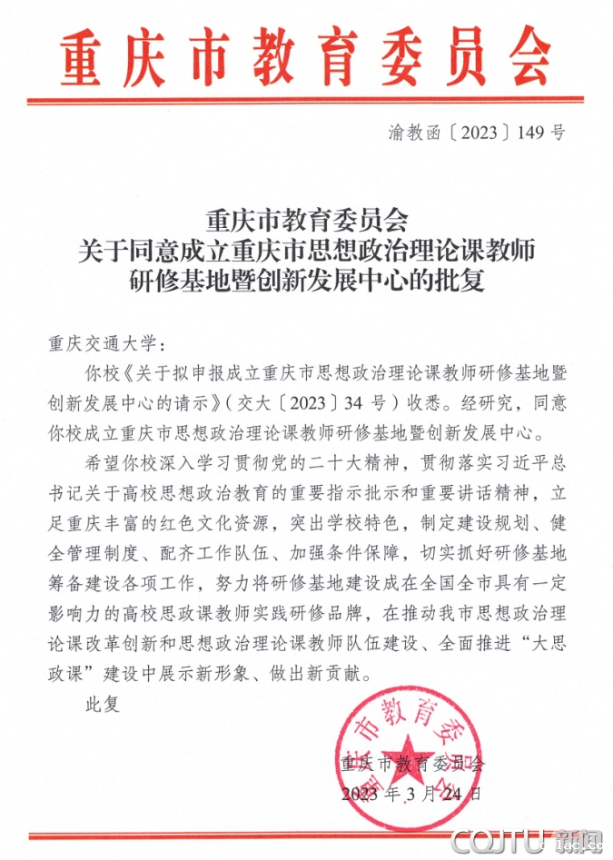 近日,学校收到《重庆市教育委员会关于同意成立重庆市思想政治理论课教师研修基地暨创新发展中心的批复》,我校获批成立“重庆市思想政治理论课教师研修基地暨创新发展中心”。