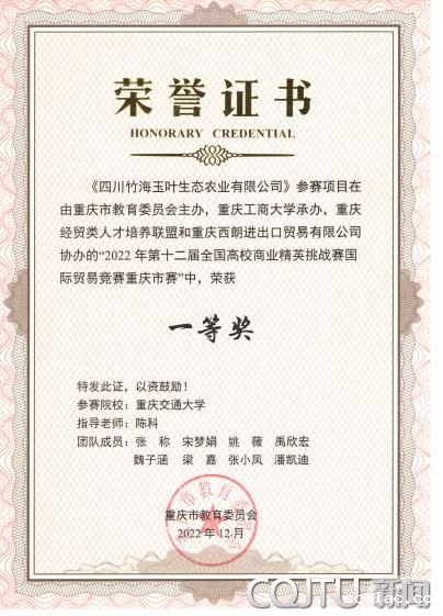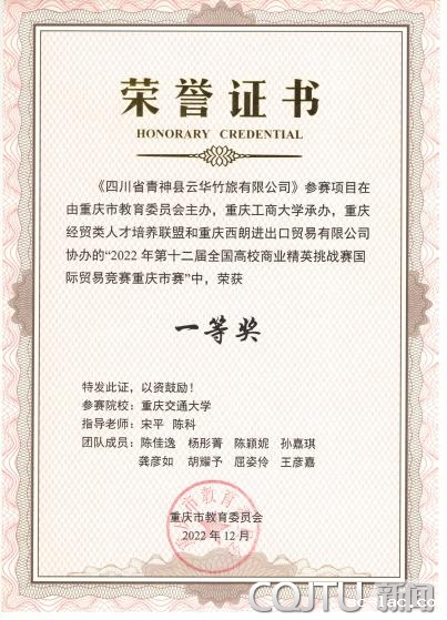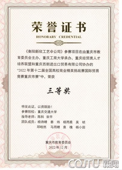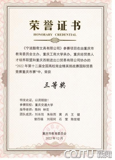 2022年11月我校校赛选拔8支本科队伍、1支研究生队伍参加第十二届全国高校商业精英挑战赛国际贸易竞赛(国际贸易业务模拟赛道)重庆市赛。近日,市赛结果公布,我校有3支队伍获一等奖,3支队伍获三等奖;经管学院陈科、宋平、冯檬莹、林花老师获评优秀指导教师。