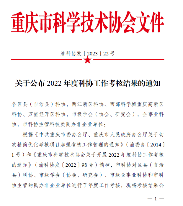 近期,重庆市科学技术协会公布了2022年度工作考核结果,我校科协2022年度工作被评为“特等”。