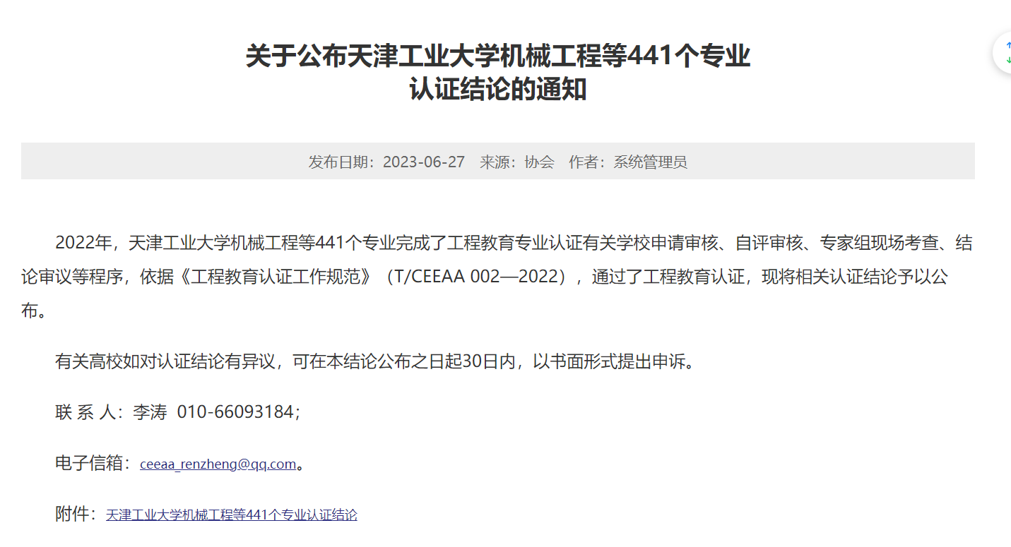 关于公布天津工业大学机械工程等441个专业认证结论的通知