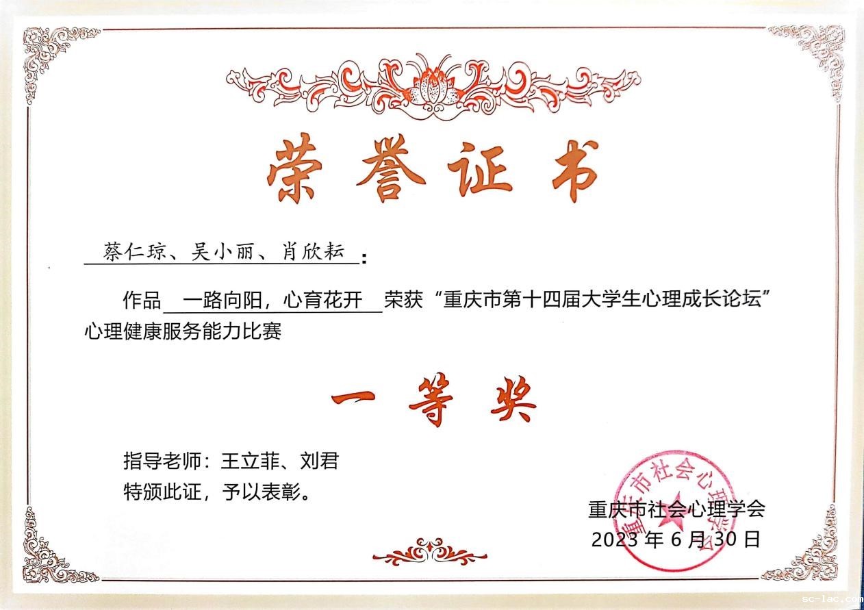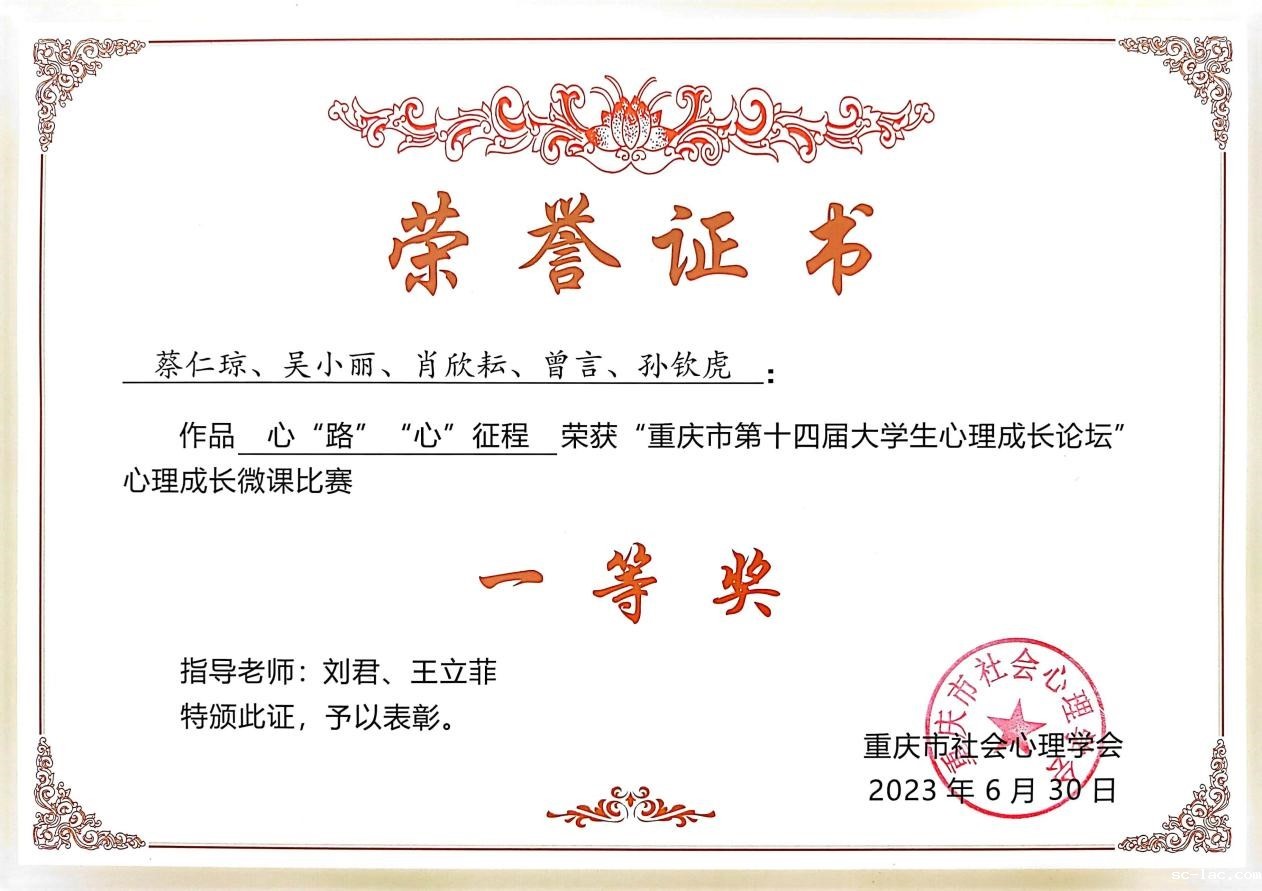 2023年3月至6月,重庆市社会心理学会面向重庆市各高校学生举办“重庆市第十四届大学生心理成长论坛”。各类比赛吸引全市40余所高校参加。马克思主义学院王立菲、刘君两位老师指导的学生团队以“心‘路’‘心’征程”及“一路向阳,心育花开”两个项目获得市赛一等奖。