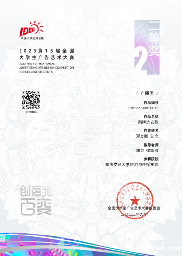 2023年9月6日,第十五届全国大学生广告艺术大赛的全国评审结果公布。我校旅游与传媒学院学生在此次大赛中获得12项全国奖项,其中包括一等奖1项、二等奖1项、三等奖1项、优秀奖9项。据统计,本届全国大赛共有来自29个赛区的1857所高校参与,收到的参赛作品总数为932848组,而获得全国奖的作品(含优秀奖)仅有7189组,获奖比例不足百分之一。