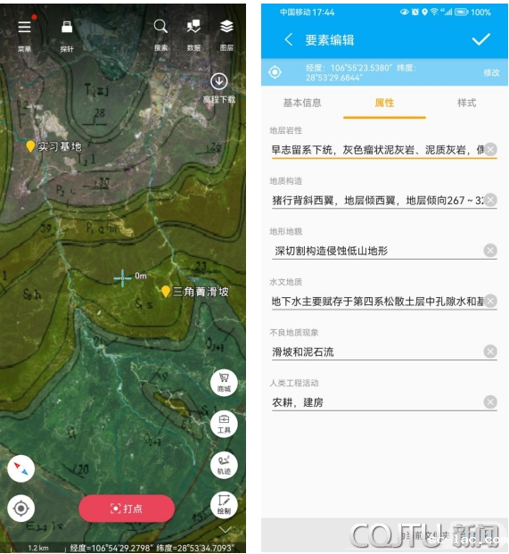 在野外环节,地质灾害现场调查全程使用外业精灵、第四纪、奥维互动地图等外业工作APP,全过程电子化记录和整理调查数据,一方面提高了实习的工作效率,另一方面让学生身临其境的感受实际工作状态,在此环节中既使用了专业工具,又训练了实际操作能力。